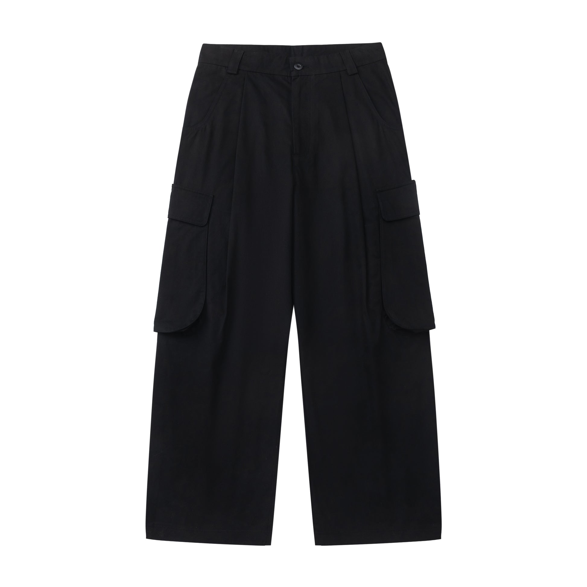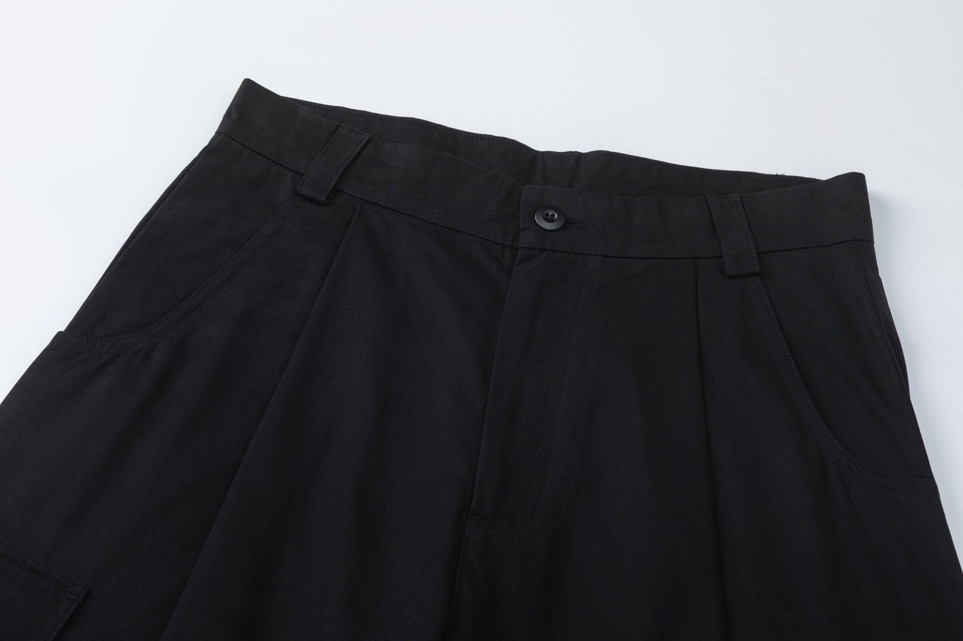These cargo slacks feature a wide silhouette and eye-catching rounded outer pockets on both sides.