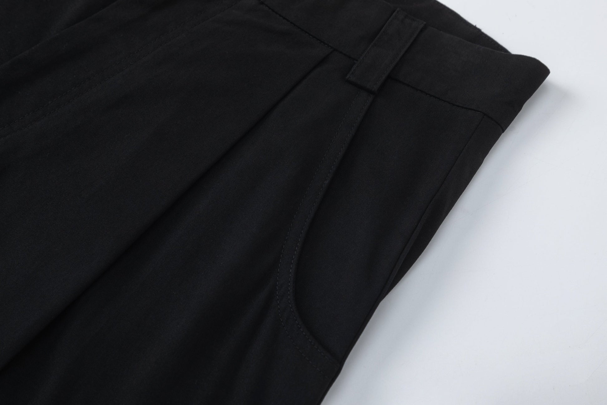 The wide silhouette with wide tucks at the waist and tapered legs gives it a voluminous yet elegant look.