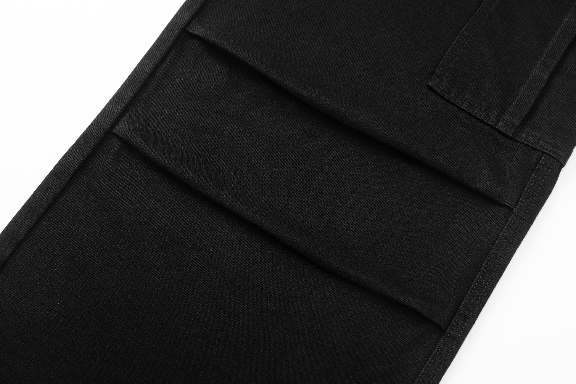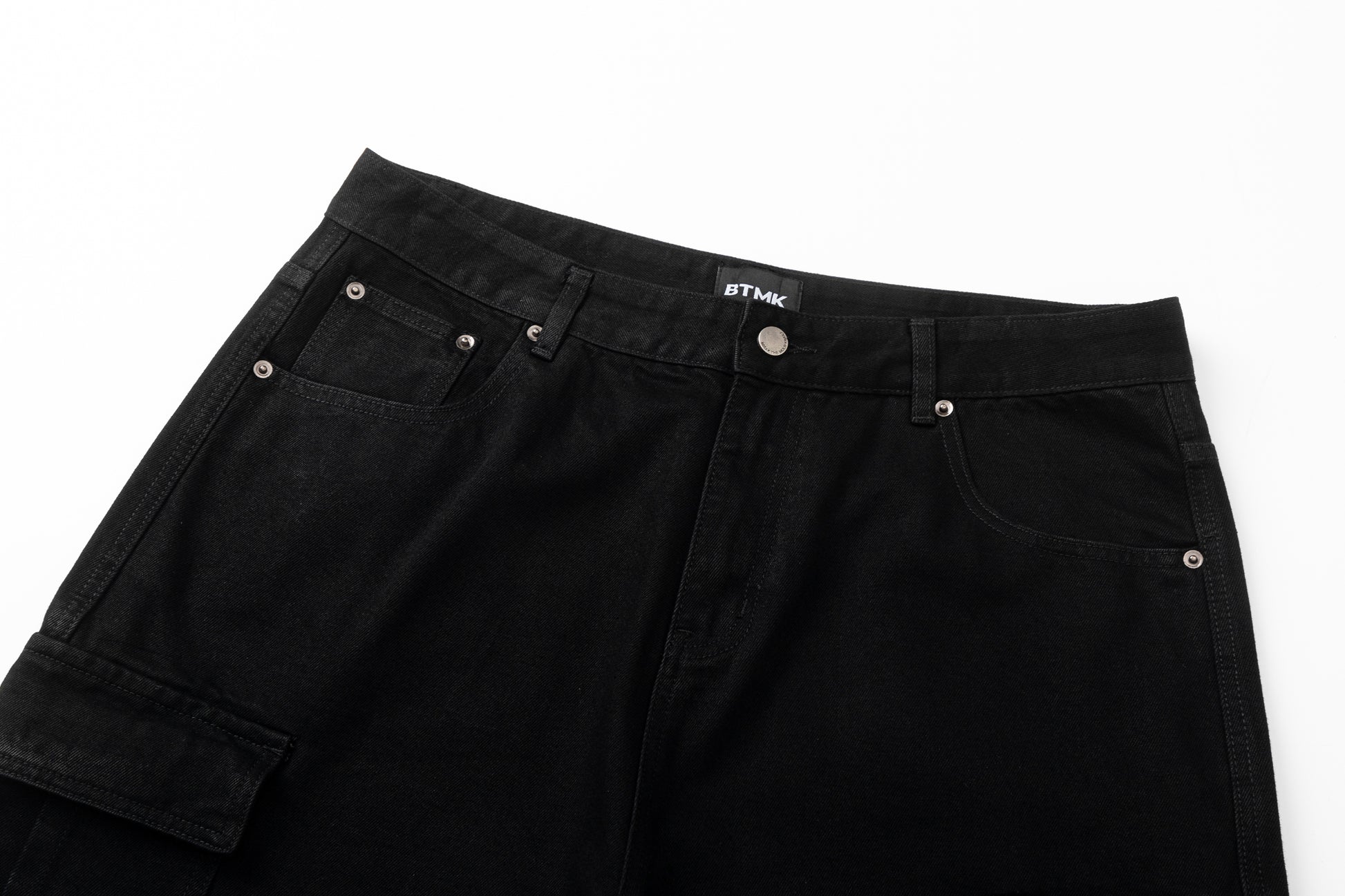 Garment dyed cargo pants made from denim with a washed finish that enhances the aged look.