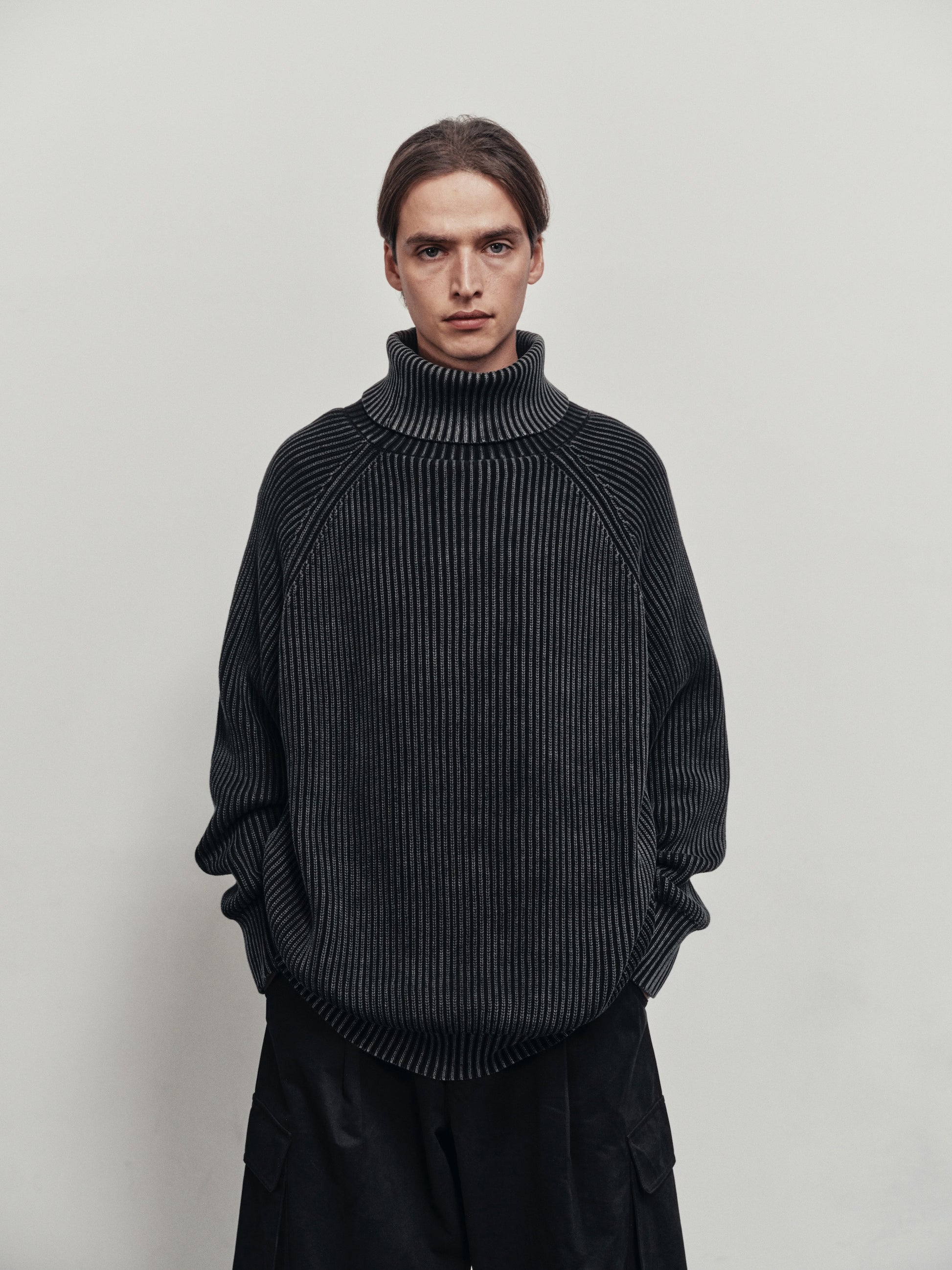 厚地で柔らかく編み上げたニットにウォッシュ加工を施したハイネックニット。