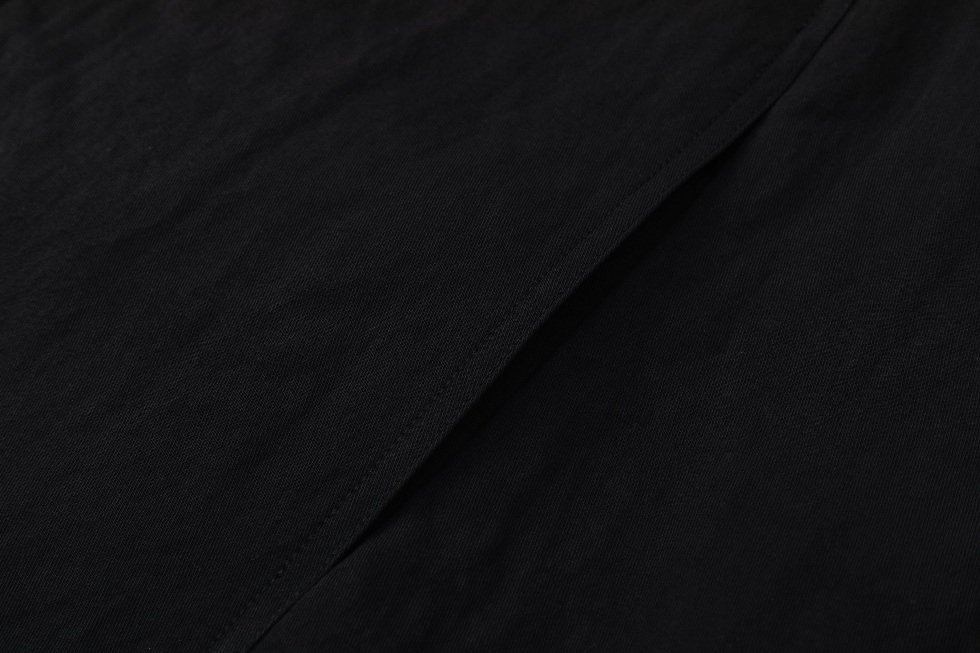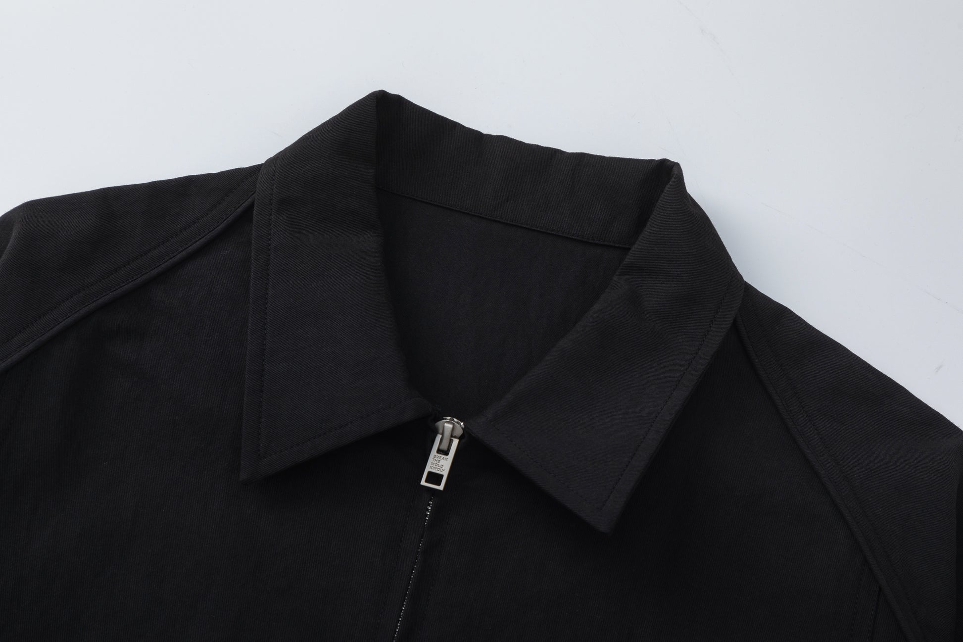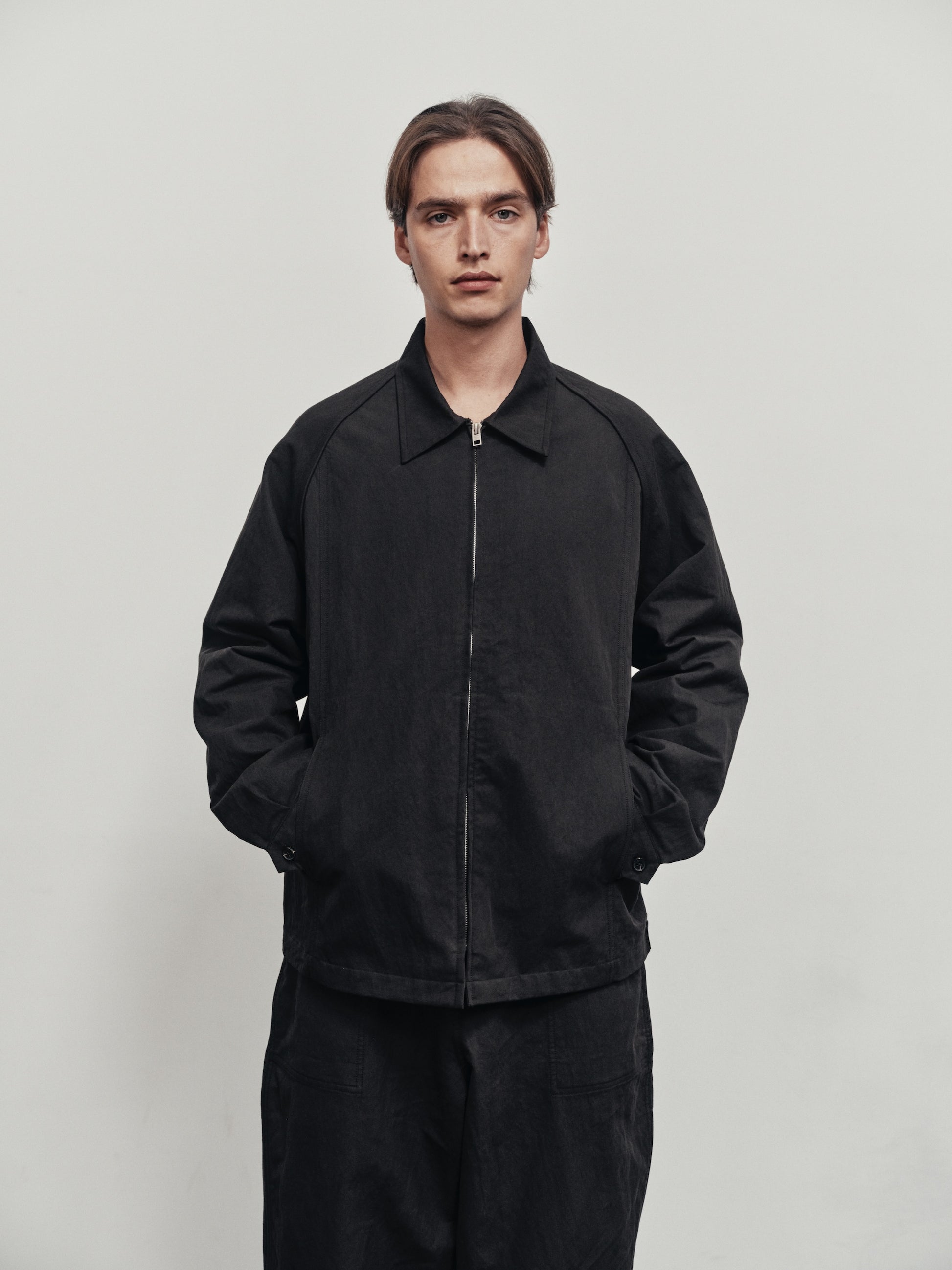 ラグランスリーブの縫い目に配したパイピングコードやフロントのシームポケット等、黒で統一したディテールによりミニマルでクリーンな印象に仕上げました。