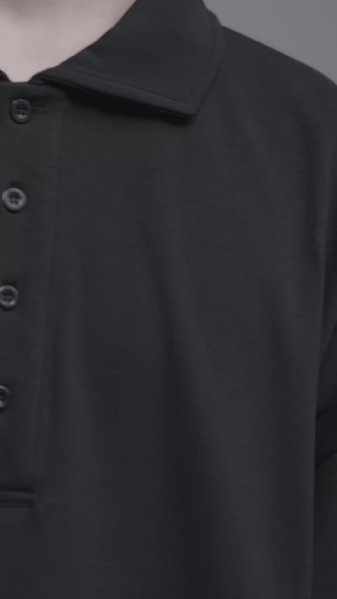 ツヤのある生地やスクエアにカットされた襟デザインの洗練された雰囲気と、ゆとりのあるカジュアルなシルエットでバランスを調和したオーバーサイズポロシャツです。