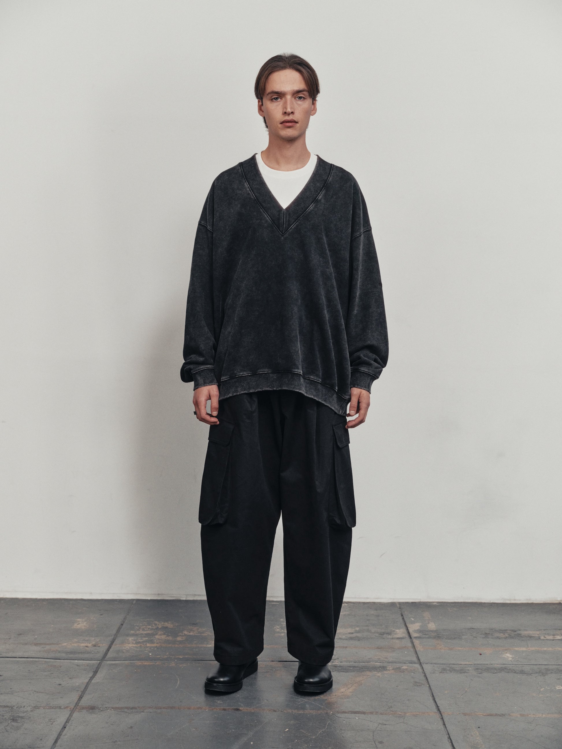 柔らかな国産コットン生地にウォッシュ加工をかけエイジング感を引き立てたVネックスウェット。